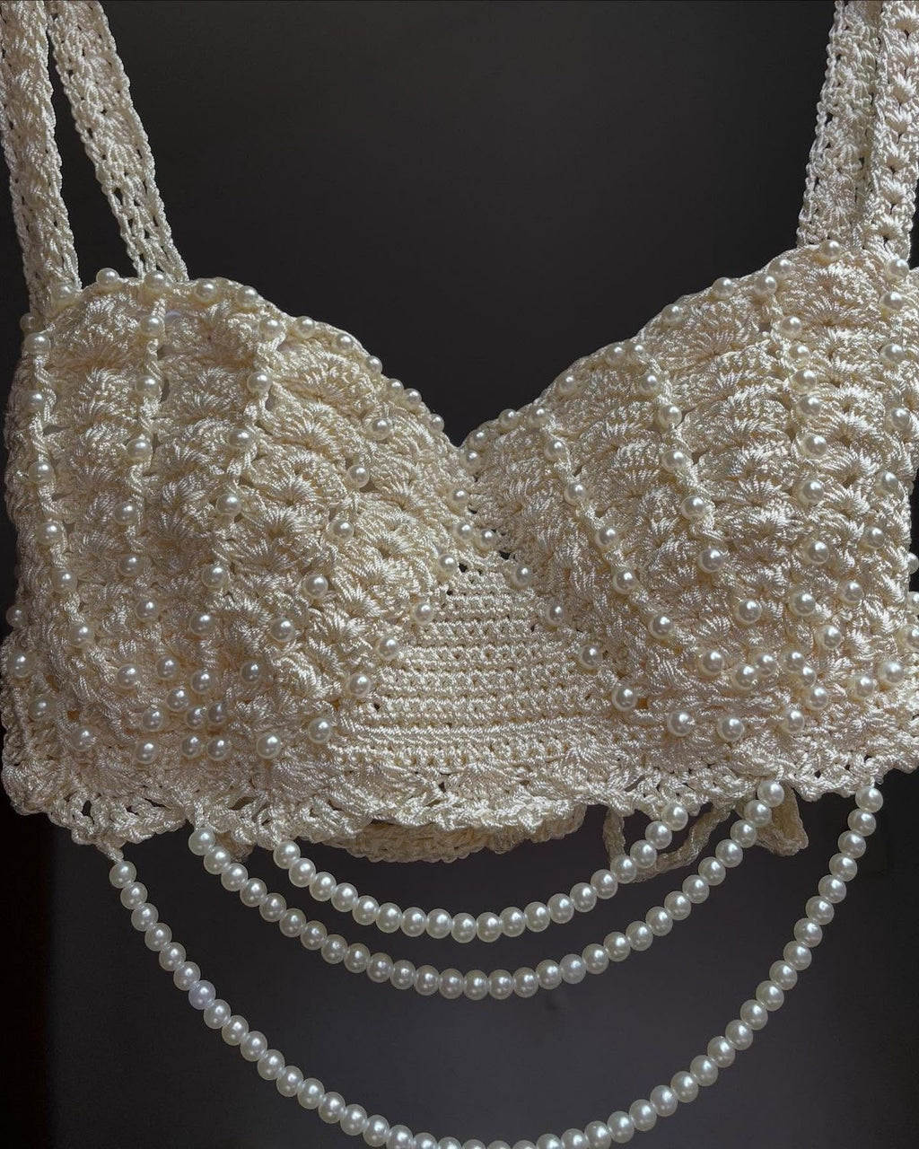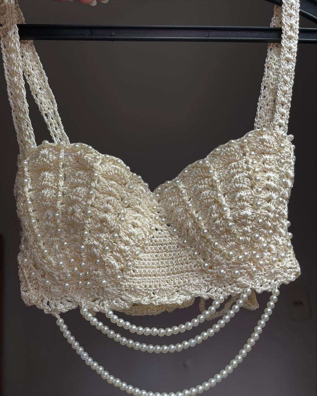 Encante-se com o charme artesanal do Cropped Sereia, feito à mão em crochê delicado e finalizado com aplicações de pérolas que remetem à elegância do mar.